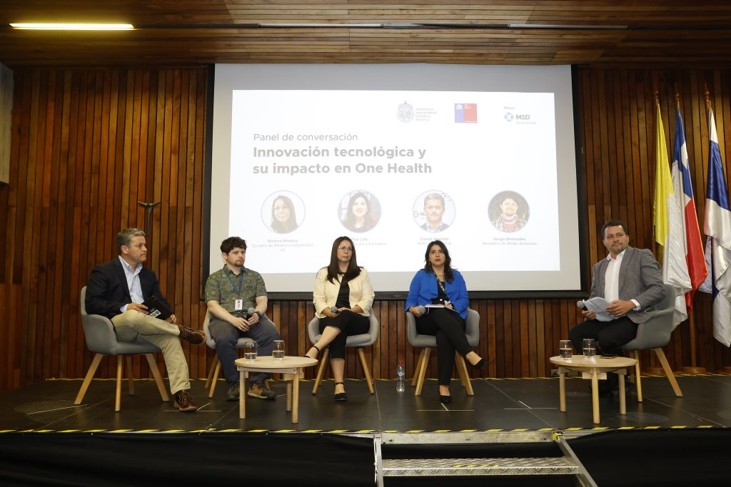Uno de los momentos más destacados fue el panel “Innovación tecnológica y su impacto en One Health”, moderado por el Dr. Pedro Jiménez. En él, se reunieron la Dra. Andrea Moreno, directora de la Escuela de Medicina Veterinaria UC; Pilar Lillo, del SAG; Daniel Guzmán, de MSD Salud Animal; y Sergio Benavides, del Ministerio del Medioambiente.