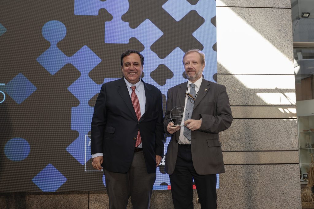 En la fotografía: Esteban Figueroa, director nacional de INAPI, junto a Francisco Gallego, prorrector de Gestión Institucional de la Pontificia Universidad Católica de Chile, quien recibió el premio en representación de la universidad.